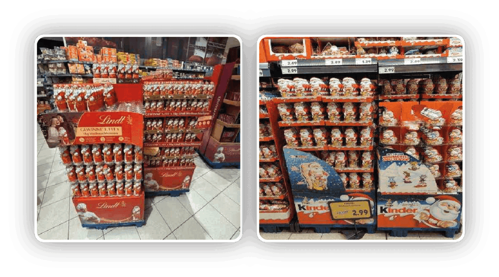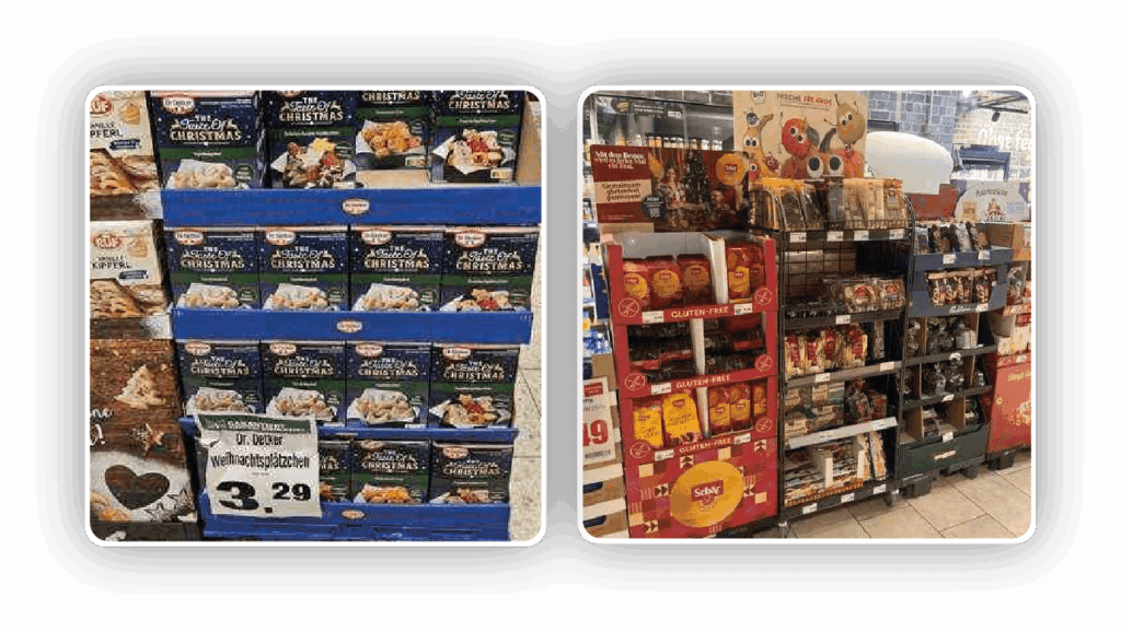 Diese Konzentration ist nicht überraschend: Gerade in einer kostenintensiven Saison wie Weihnachten achten Kund*innen besonders auf Angebote. Die Aktionsfläche wird dadurch zum natürlichen Anziehungspunkt für saisonale Käufe.